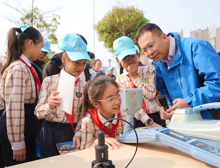 設(shè)置在廣場上的“水科技設(shè)備展”專區(qū),從專業(yè)的管道檢測儀,到神秘的節(jié)水水表,再到功能強(qiáng)大的小型排水車,各具特色的專業(yè)設(shè)備吸引了大家駐足觀看、拍照,不少學(xué)生更是拿起設(shè)備,來了一輪沉浸式的體驗(yàn)。